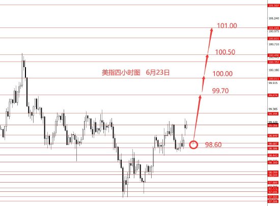 6月23日,美指上周正如预期二次探底后向上反弹,并成功站稳98.80上方。从图形来看,底部形态已见雏形,本周继续逢低做多美指,延用上周一框架即可。本周一跳空高开,下方重点关注98.40,以上偏向于看涨,继续逢低做多,周一早盘先重点关注99.30强阻力吧,若一次成功上破,则继续向上运行,若99.30承压,周一在99.30-98.60区间震荡的概率较大些,震荡完,继续逢低做多美指。本周操作建议:98.60-98.70区域做多,止损97.90,目标看向99.70和100,再看向100.50和101.00区域。控制仓量,严格止损。